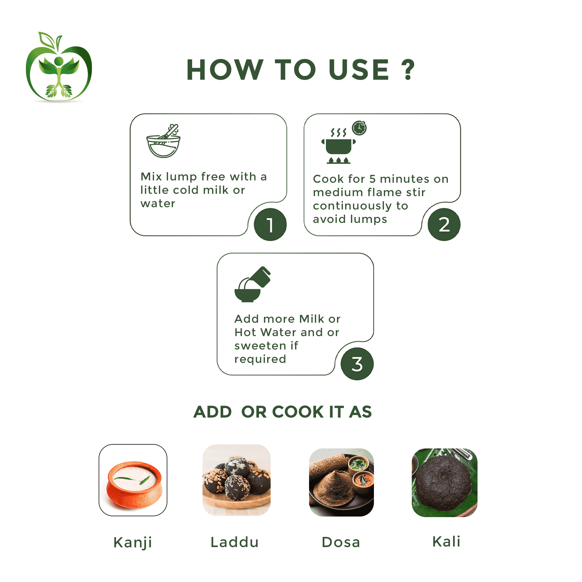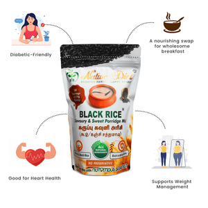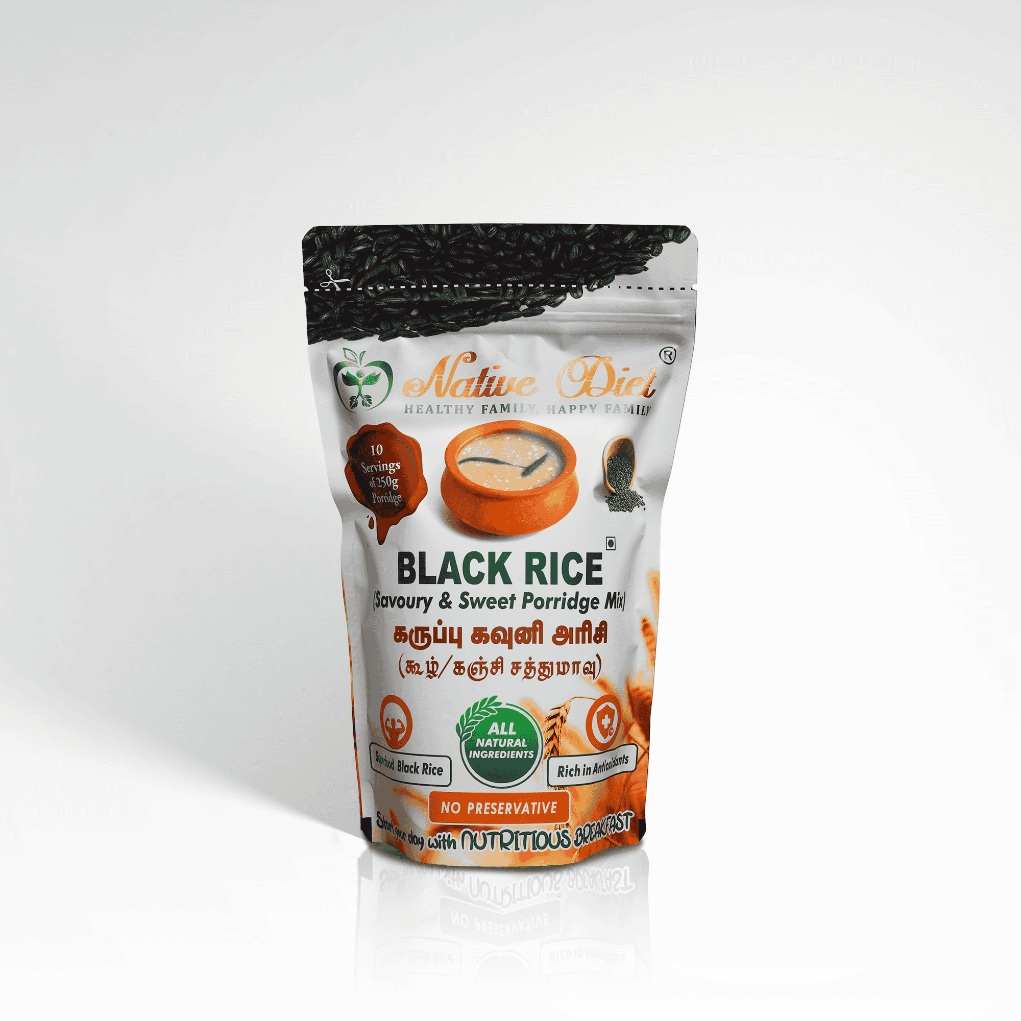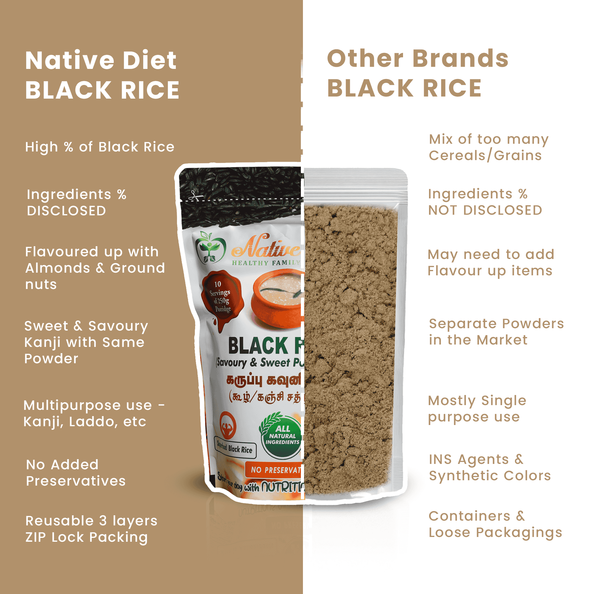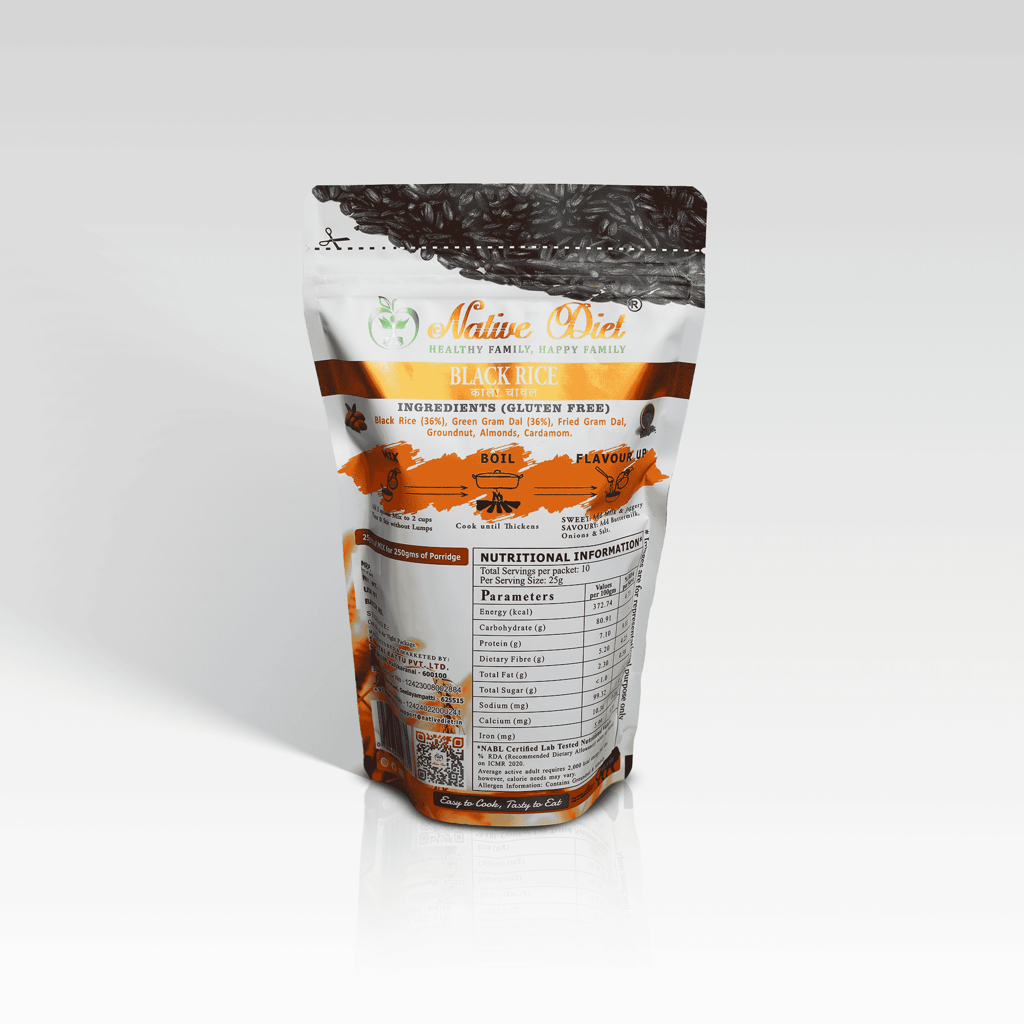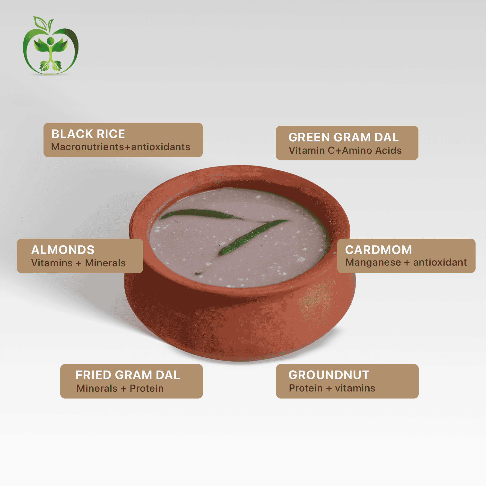 Black Rice (36%), Green Gram Dal (36%), Fried Gram Dal, Groundnut, Almonds, Cardamom.