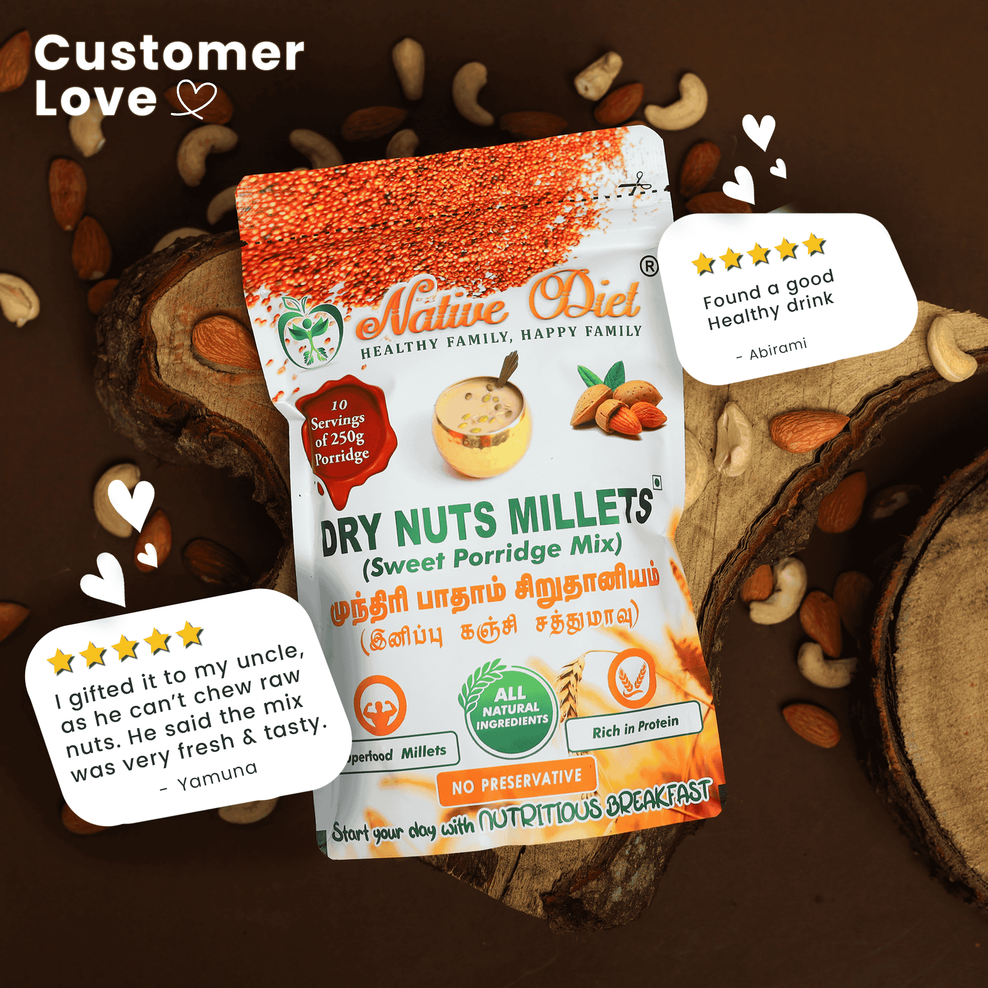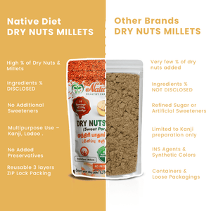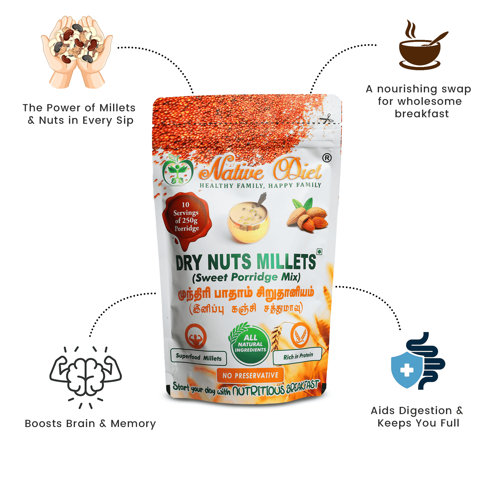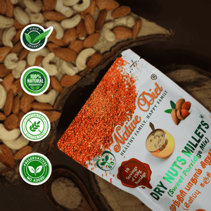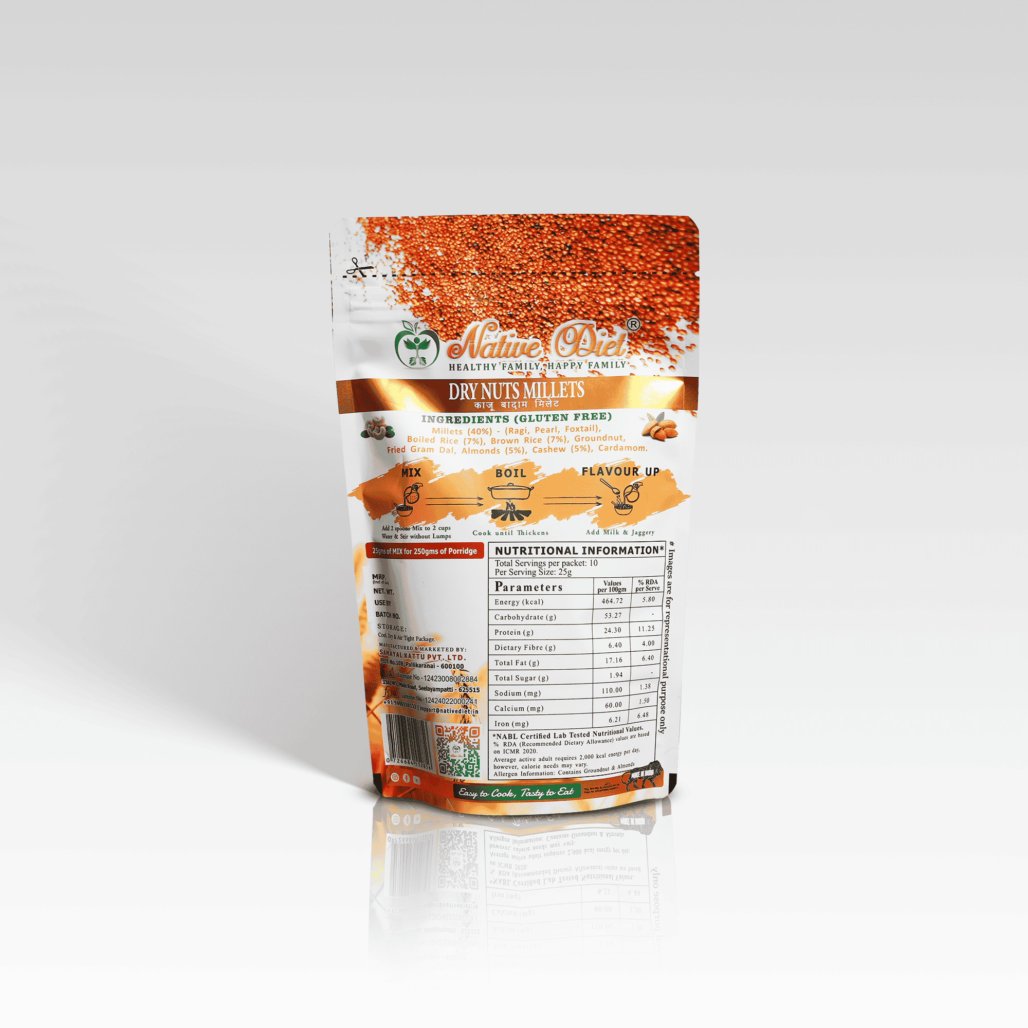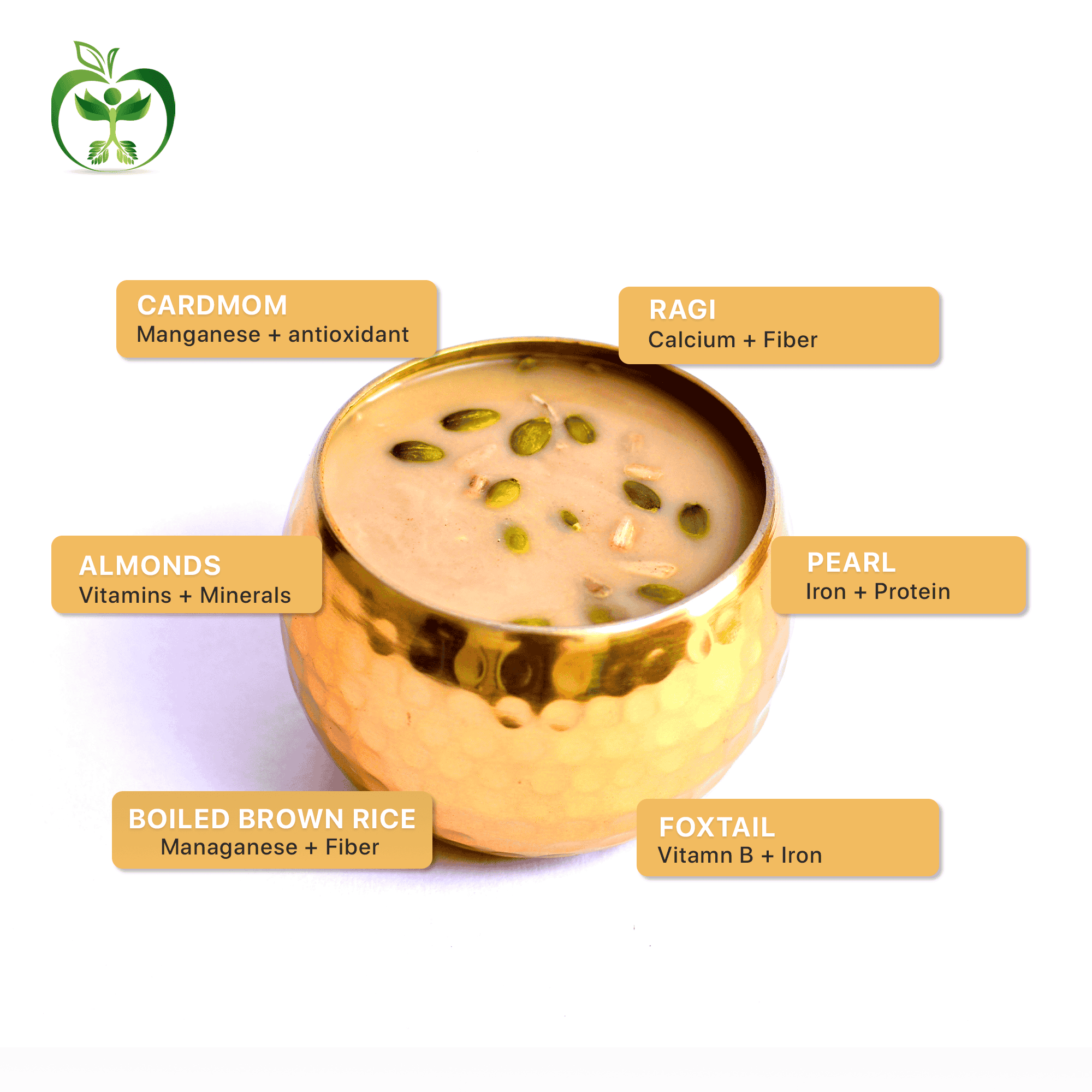 Millets (40%) - (Ragi, Pearl, Foxtail), Boiled Rice (7%), Brown Rice (7%), Groundnut, Fried Gram Dal, Almonds (5%), Cashew (5%), Cardamom. No Preservatives. All Natural Ingredients.