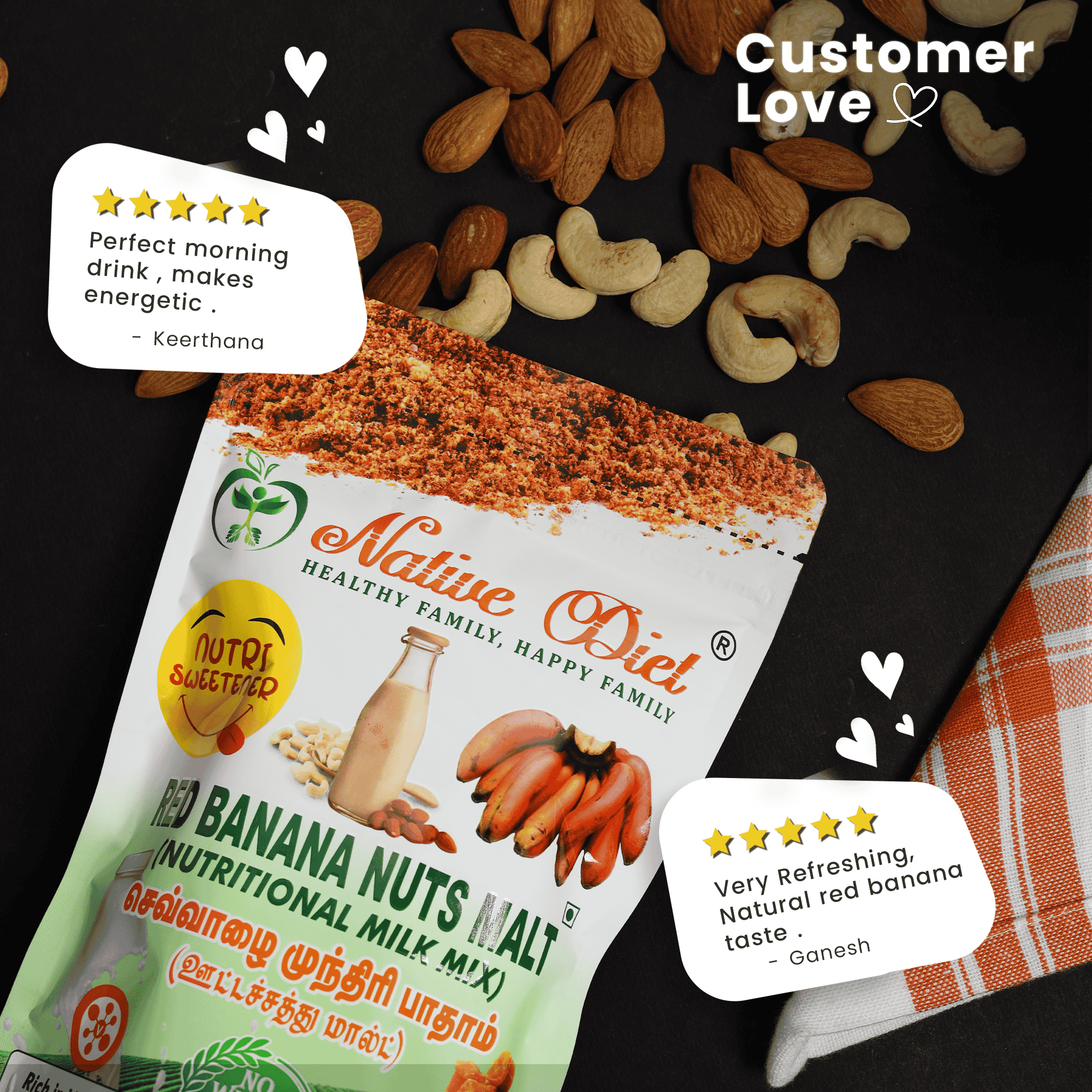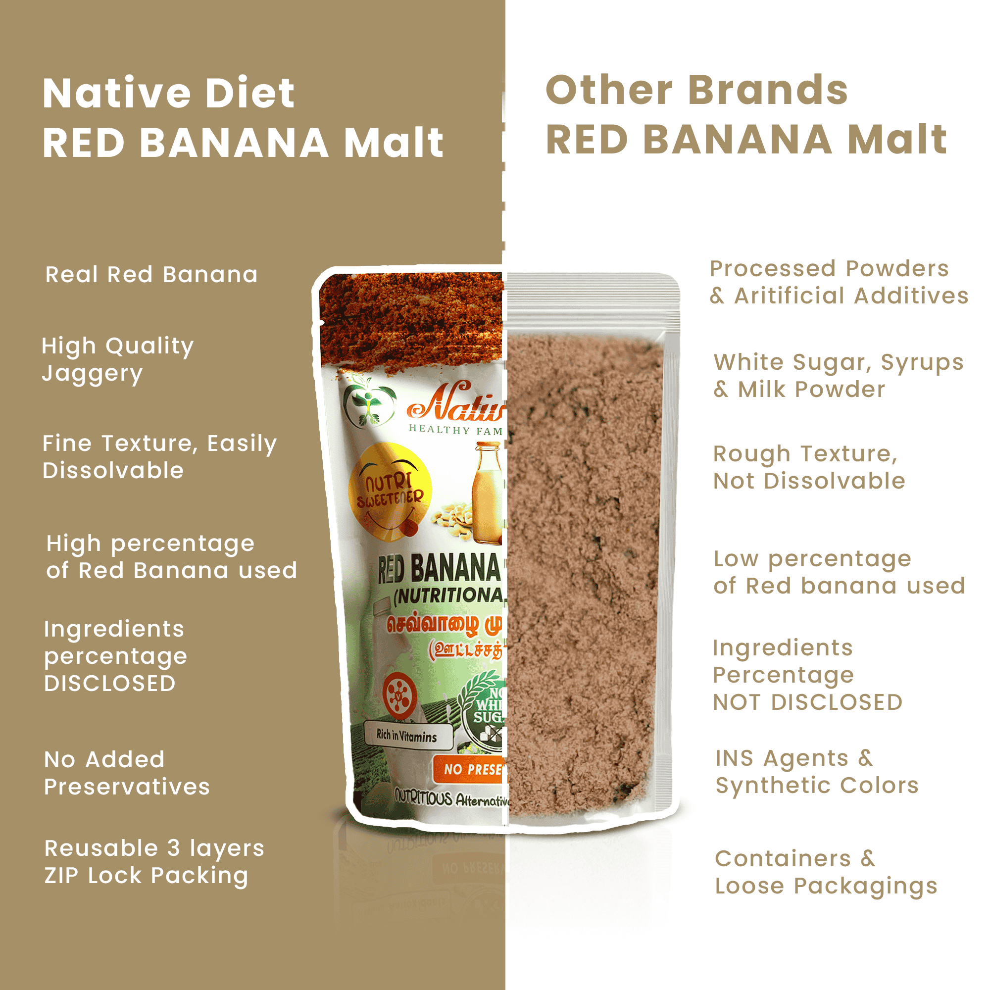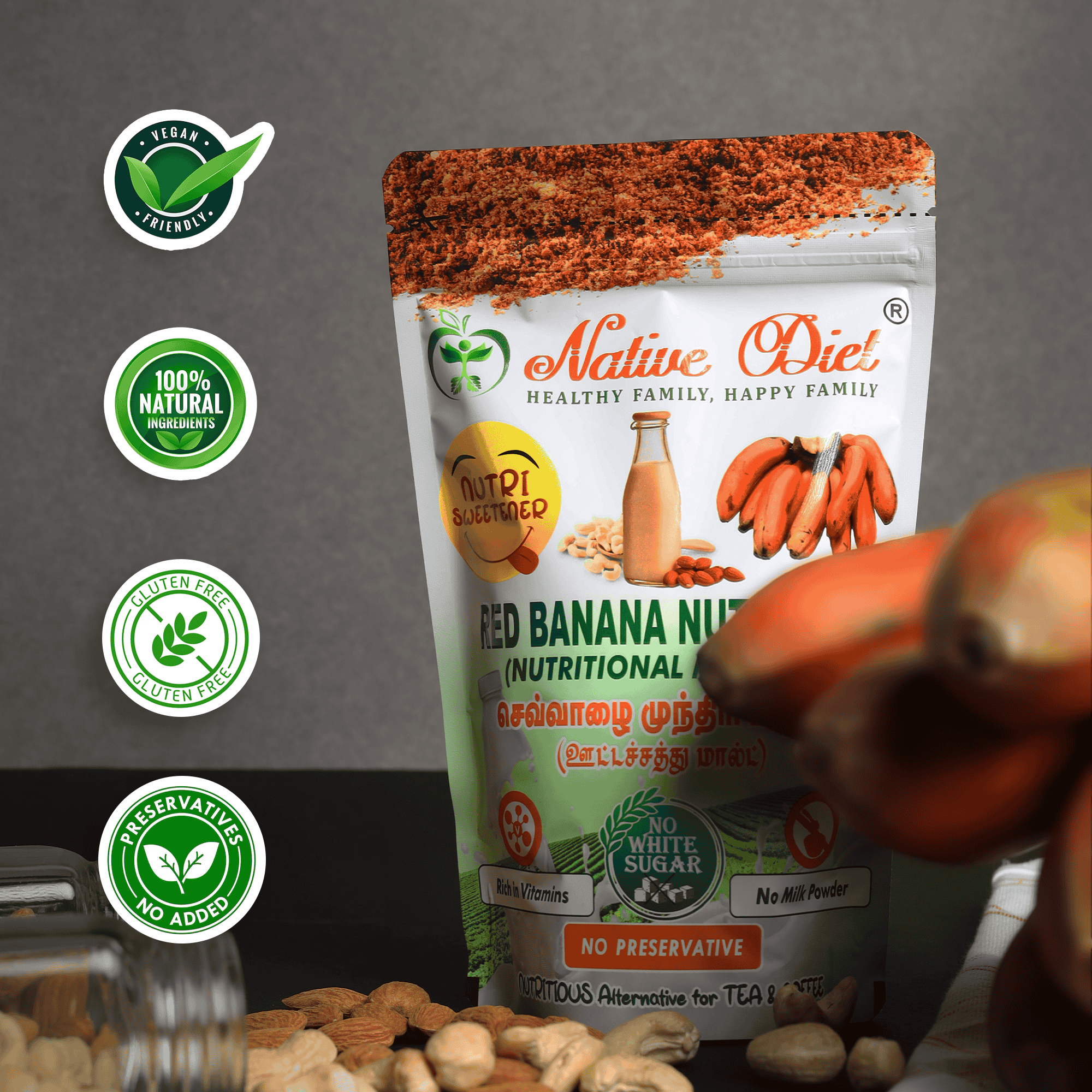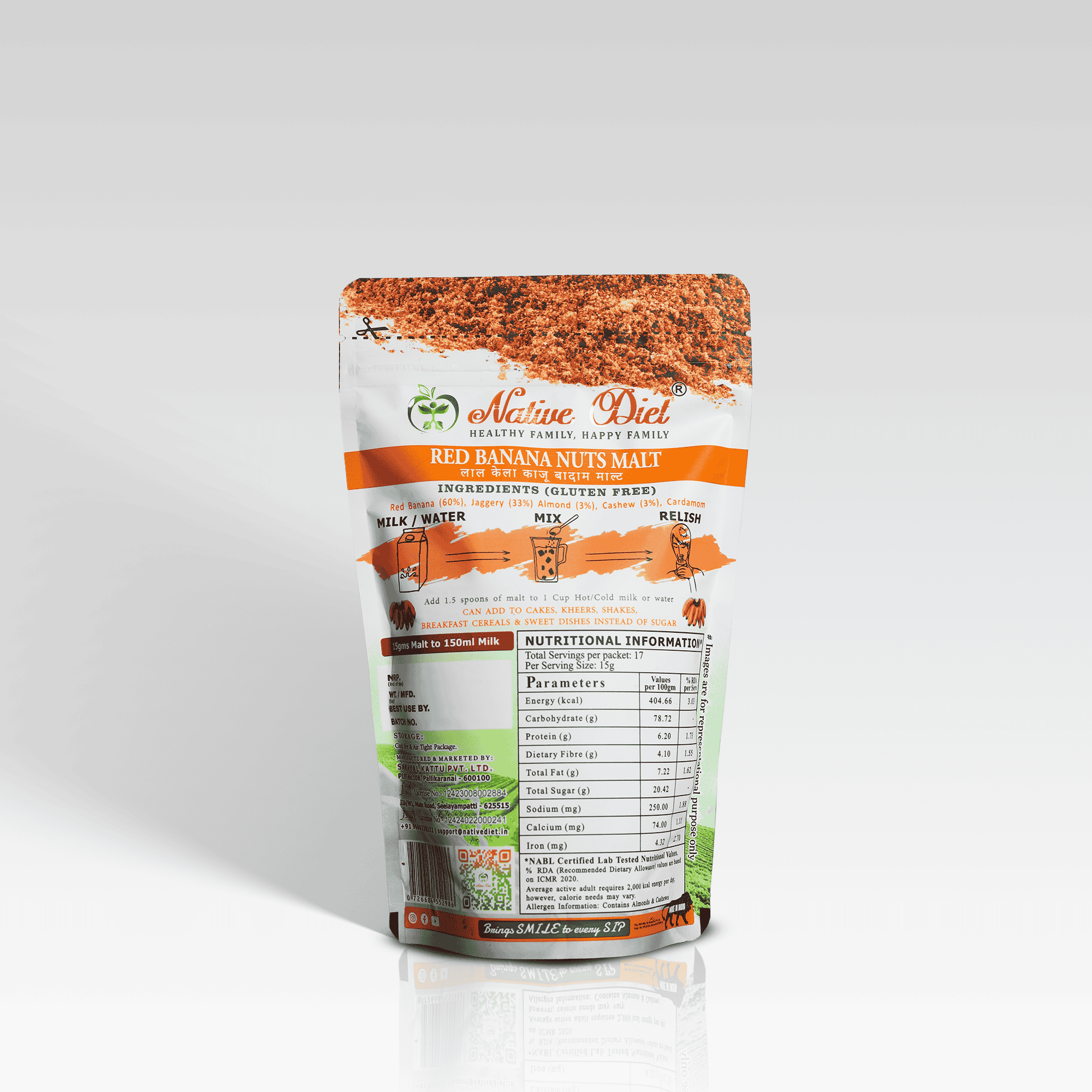 Red Banana (60%), Jaggery (33%) Almond (3%), Cashew (3%), Cardamom. No Preservatives. All Natural Ingredients.